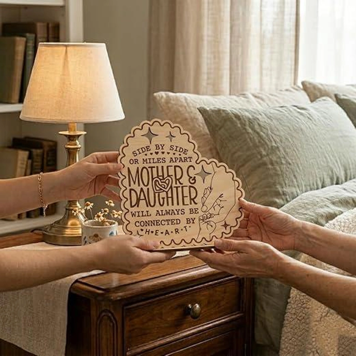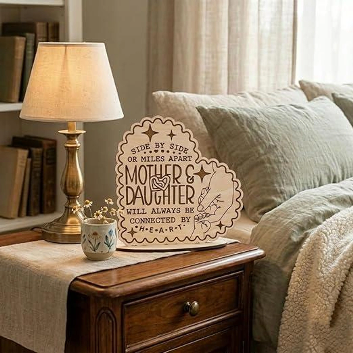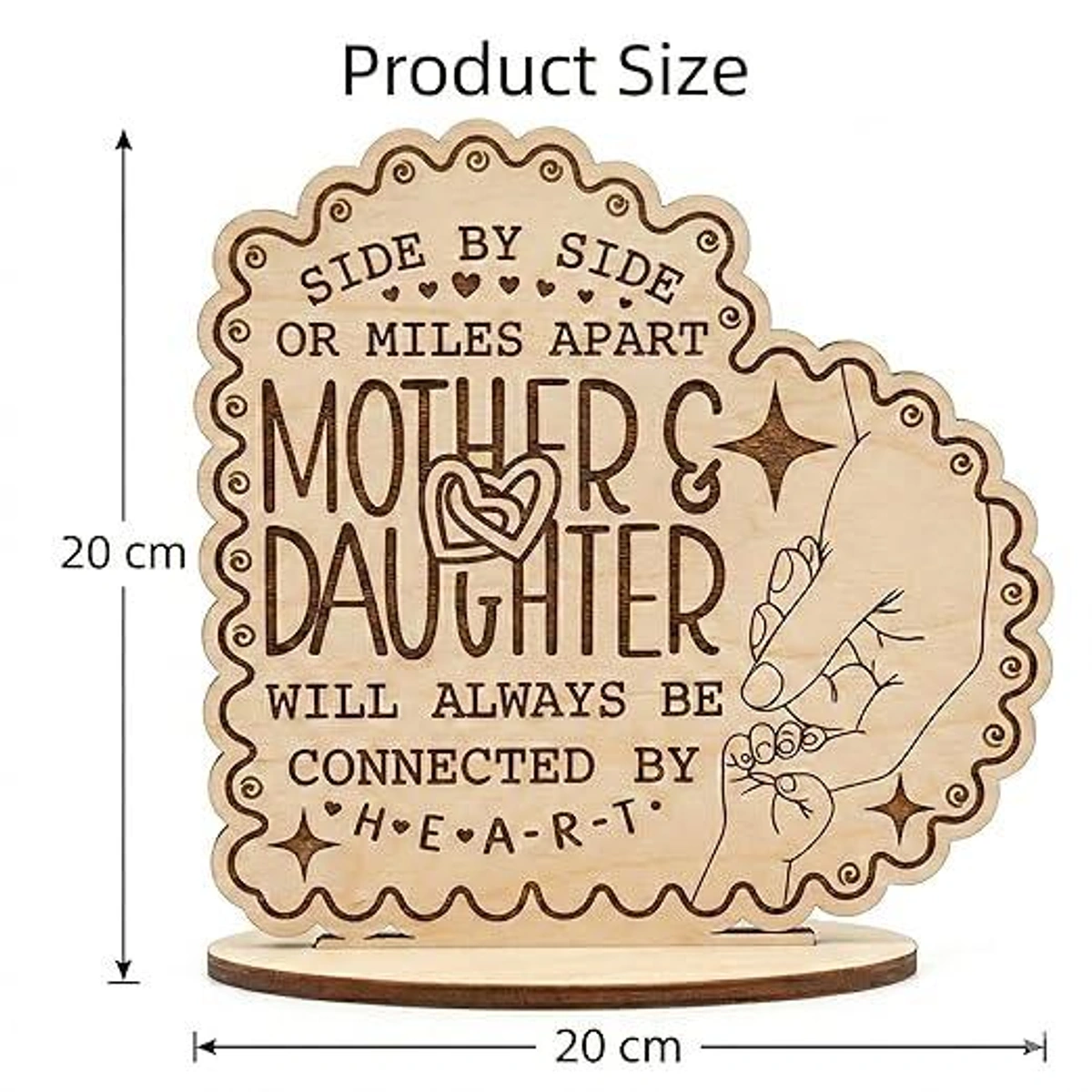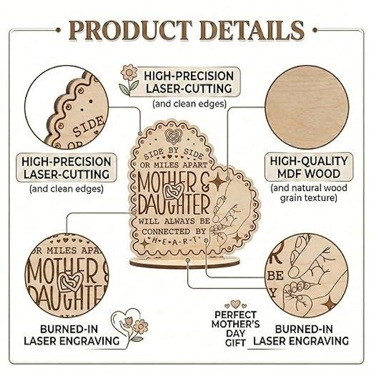 - التصميم: قاعدة خشبية مزخرفة على شكل قلب مع اقتباسات معبرة عن علاقة الأم وابنتها