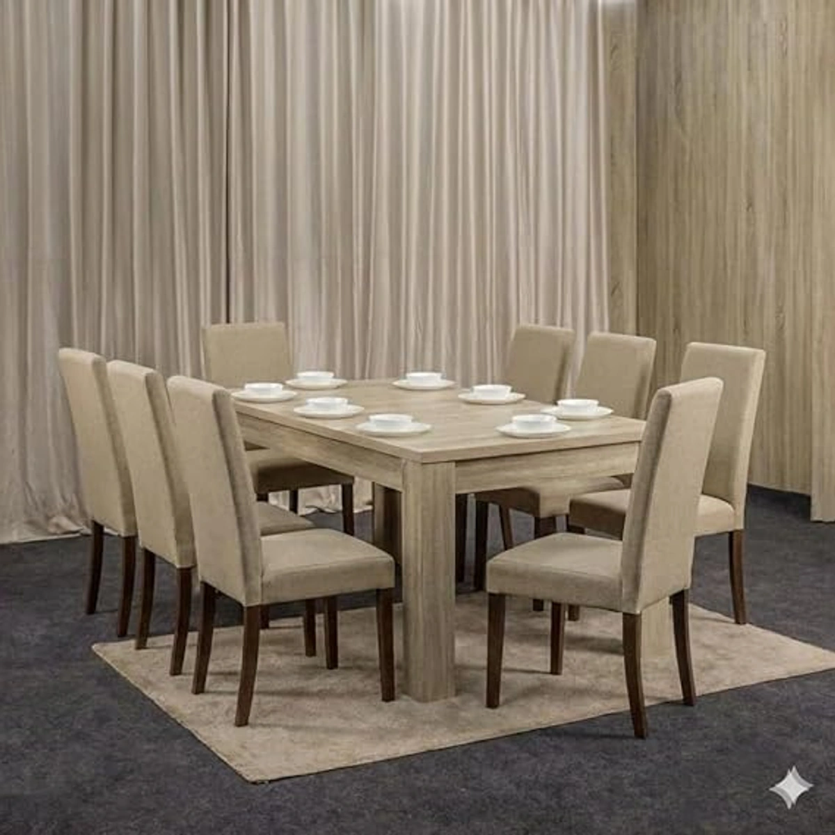 - 8 كراسي مريحة بكسوة قماش كتان أنيق وعالي الجودة.