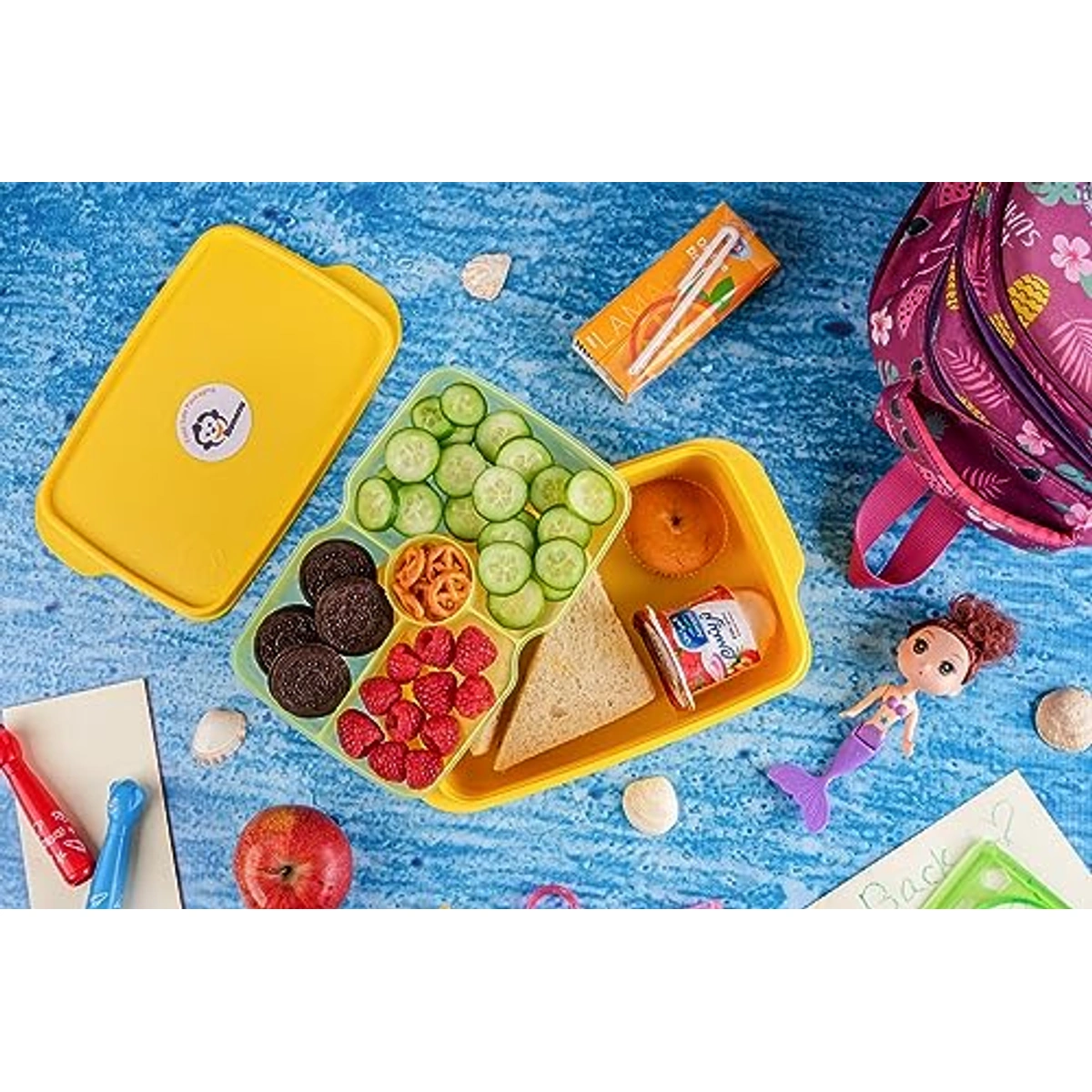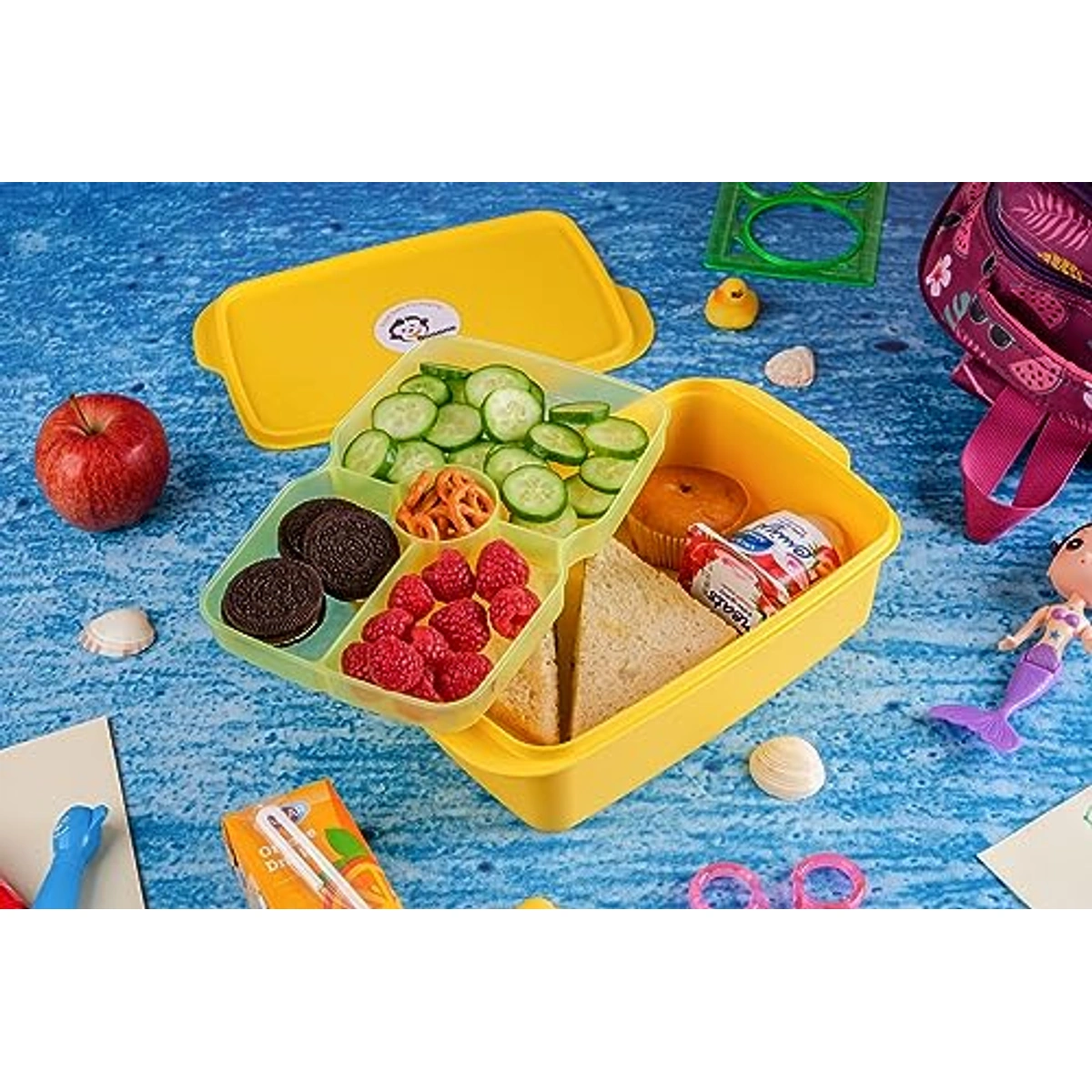 - تصميم عملي بطبقتين وفواصل داخلية لتنظيم وجباتك المتنوعة.
